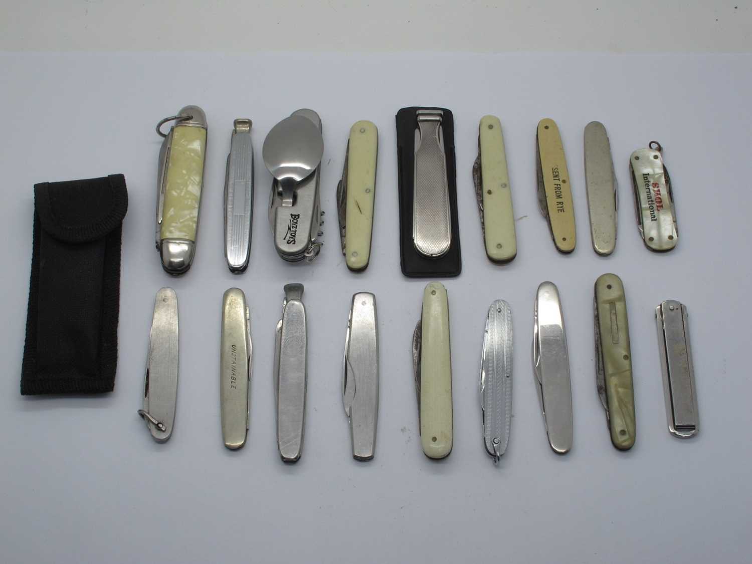 Pocket Knives; William Rodgers Sheffield, two blades; Richards, one blade, can opener, saw, bottle opener; Richards smokers knife; Two advertising knives, etc. (18) (573796)