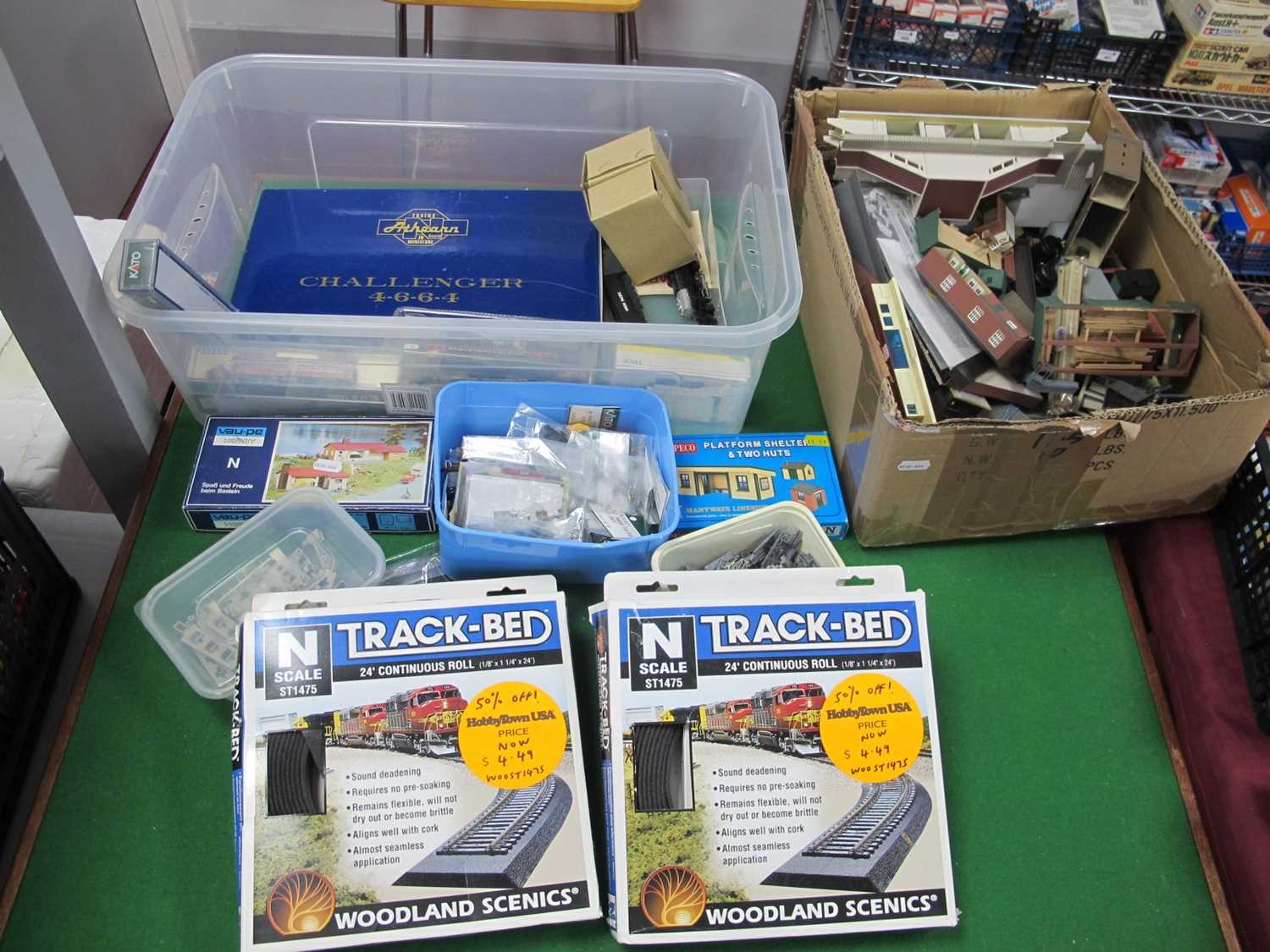 Two "N" Gauge U.S.A Outline Steam Locomotives, for spares and or repair; comprising a Rivarossi (unboxed) "Big Boy" 4-8-8-4 Union Pacific, R/No. 4013 (rear bogie detached, small parts loose), and an Athearn boxed Ref No. 11803 "Rio Grande" 4-6-6-4 Challenger (front bogie detached "1st "6" Driving Set, also loose", parts appear present). Plus a Trix Class V60 DVB Rail, for repair, seven coaches all overpainted, an Atlas GP-35 for spares/repair and a small quantity of loose and "Poly Bagged" spare parts, etc; also a quantity of boxed and made up mainly plastic buildings, (station, industrial, etc) and scenic items).