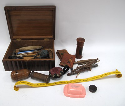Lot 1318 - Bobbins, pink pin box, treen needle holder,...